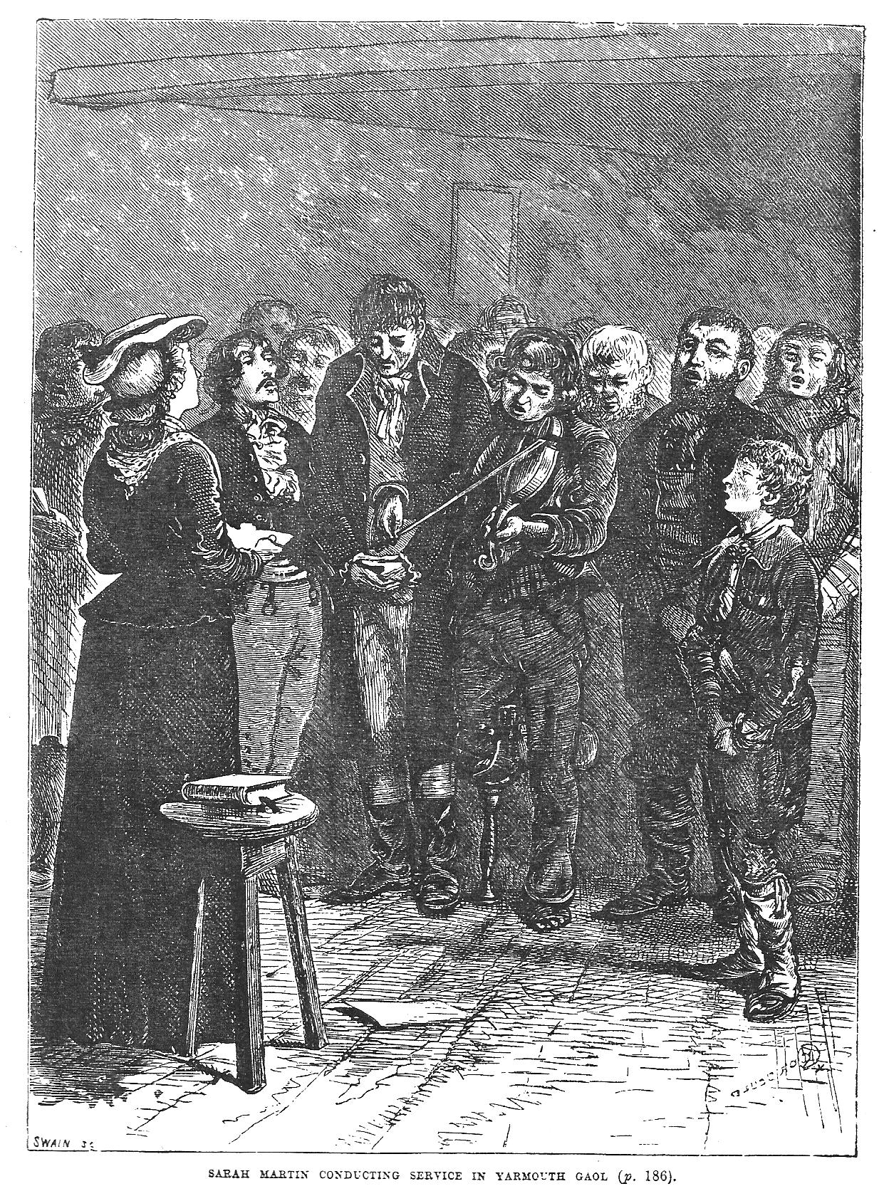 ‘Sarah Martin conducting service at Yarmouth Gaol’ in Edward Hodder, ‘Heroes of Britain in War and Peace’, London: Cassell, c. 1878, p. 186. The image of the fiddler is probably fanciful!